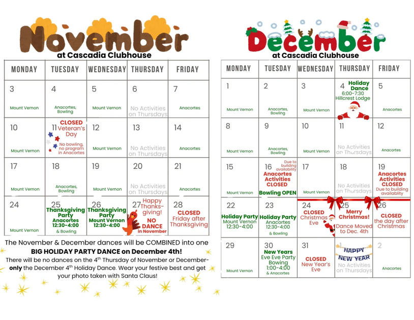 No dance in november. holiday dance is thurs., dec 4th 6pm - 8pm. See schedule below.